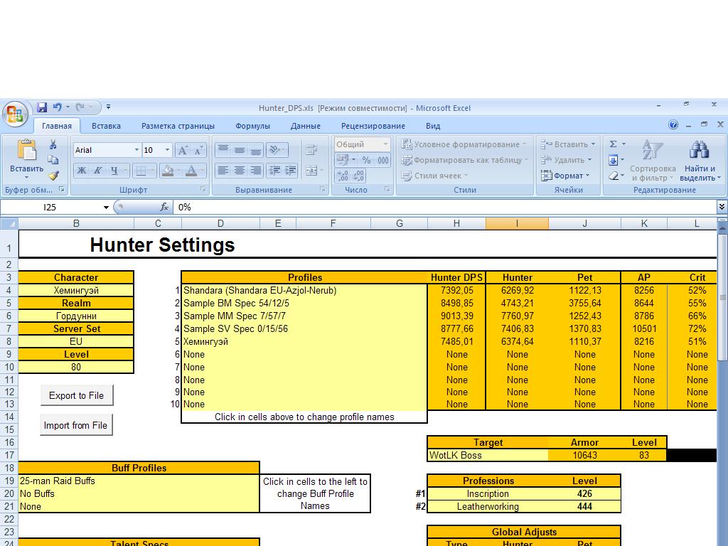 | Итак,еще одна вещь-Калькулятор Шандары Скачать его Нужен MS Excel для отображения. Убираем защиту от макросов и приступаем: 1)Идем в закладку Overview и вводим про себя данные – имя в поле Character и игровой мир в поле Realm. Правей в поле Profiles выбираем один из списка и называемся Если у нас есть собирательная профа, выбираем ее из списка в поле Gathering Skill. (Только одну, к сожалению) И вводим символы в табличке Glyphs. 2)Отправляемся в закладку Gear, то есть «шмот» и видим доспехи доблестной Шандары. Справа от ячейки Profile выбираем наш профиль и жмем кнопку Load Gear from Armory. Если мы правильно ввели имя и мир, если есть интернет, если оружейная работает- наши вещи, зачарованные и вместе с камнями заполнят соответствующие ячейки (В противном случае придется заполнять все ячейки самим, уфф.). После этого сохраняем профиль нажатием кнопки Save profile 3)Заходим в закладку Talents и кнопаем Read from Armory. Наши таланты появятся в ячейках. В случае активного сопротивления оружейной можно вытянуть их из вовхеда или ммо-чемпиона в поле ниже. 4)Пришла пора баффов. В закладке Buffs глядим, что у нас есть в рейде, а чего нету, исправляем. Можно нажатием кнопки Clear Buffs остаться девственно чистым телом и душой. 5) В закладке Shot Rotation настраиваем приоритеты выстрелов – таблица Shot Priority. 6) Глядим закладку Pet. Поскольку близзы почему-то забыли добавить их в оружейную, придется вводить таланты и прочее самим. 7)Возвращаемся в закладку Overview и нажимаем кнопку CalcAttributes, которую хитрая Шандара спрятала далеко внизу справа. Что ж мы получили в результате всех этих мучений? В закладке Gear видим наш идеальный дпс! Переставляя снаряжение, камни, зачарования туда-сюда, сразу видим, что лучше, а что хуже. А в закладке Overview внизу - чуть более подробную информацию.